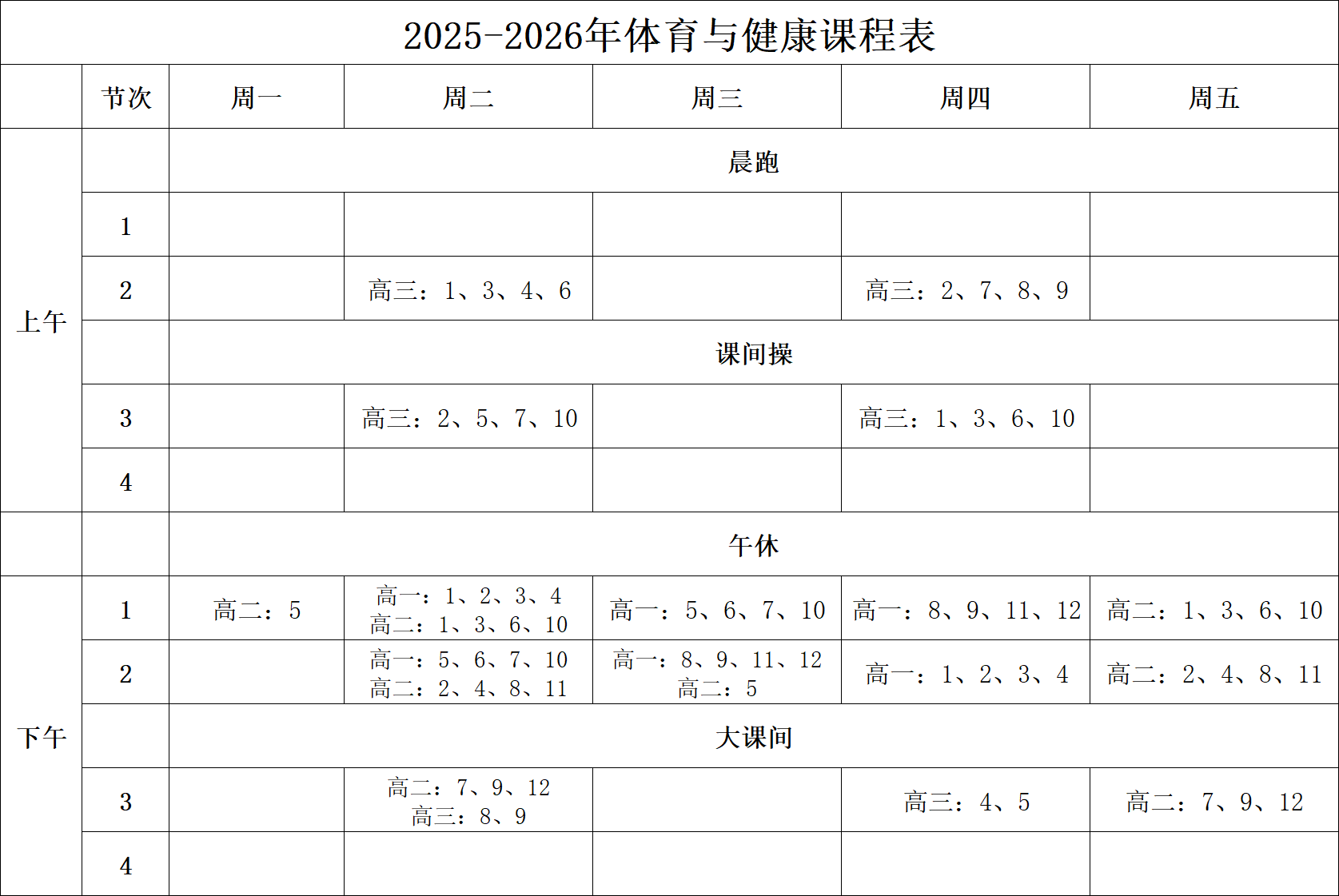 2025年度体育课程表及三好生..