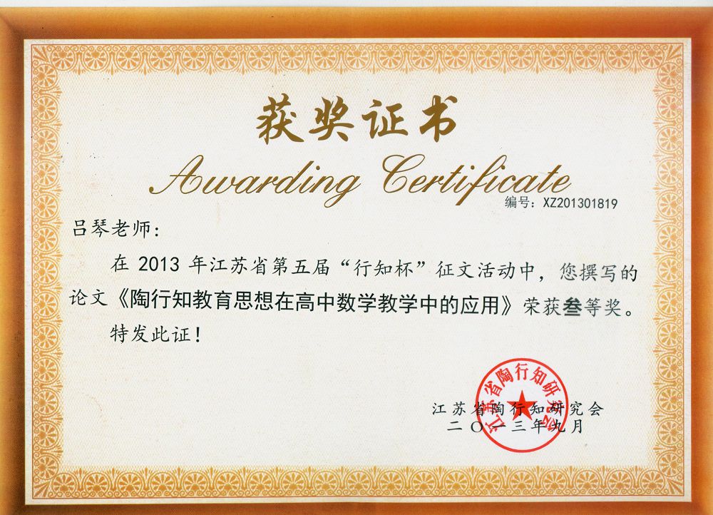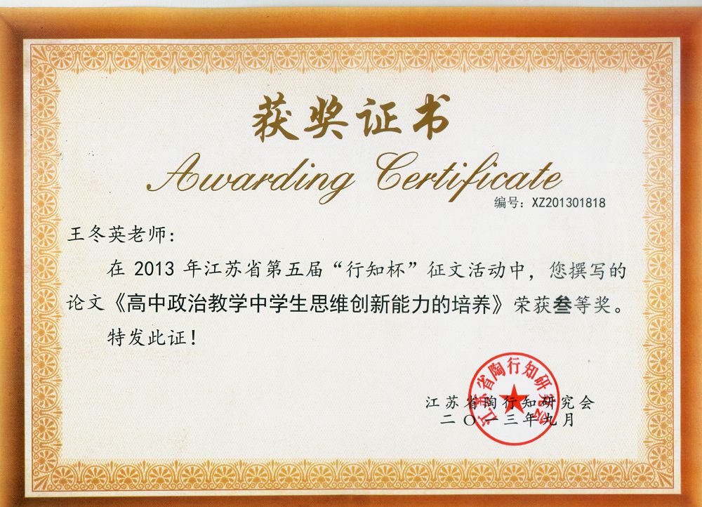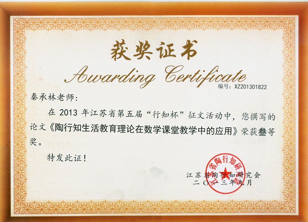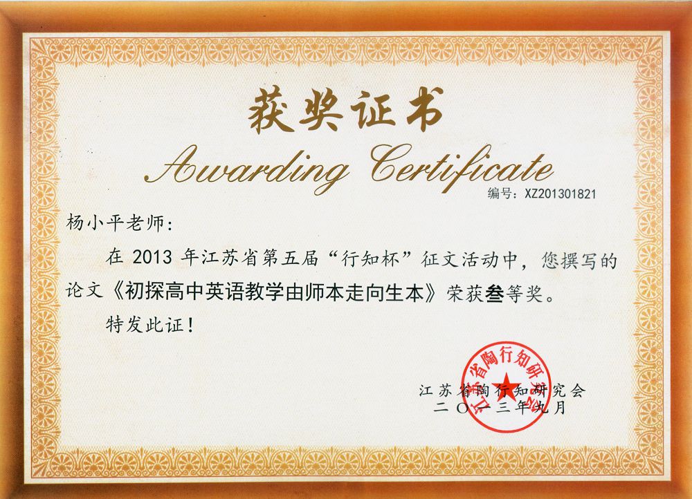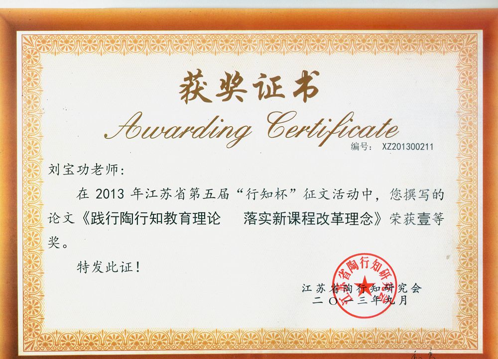 在2013年江苏省第五届“行知杯”征文在,我校刘宝功等九位老师撰写的论文荣获大奖,其中刘宝功老师撰写的《践行陶行知教育理论,落实新课程改革理念》荣获一等奖,曹建兰老师撰写的《将陶行知生活教育理论运用到班级管理中》荣获二等奖,秦承林、张光红、徐建峰、杨小平、吴晓燕、王冬英、吕琴等七位老师荣获三等奖。