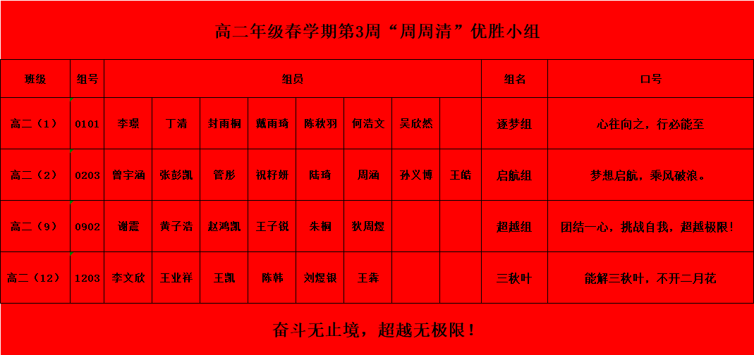“赛场砺锋芒,勤学筑梦想。真正的优秀,从不是一蹴而就的奇迹,而是日复一日的坚守与精益求精的追求,每一次比拼都是成长的契机,每一份坚持都将收获回响。”为深化“周周清”教学成效,激发学生比学赶超的浓厚氛围,引导学生及时查漏补缺、巩固所学,锤炼扎实的知识功底;近日,我校高一、高二年级分别开展“周周清”PK赛,以赛验学、以赛促学,展现了四中学子昂扬向上的精神风貌。现对各年级优胜班级、优胜小组及优秀学生予以表彰: