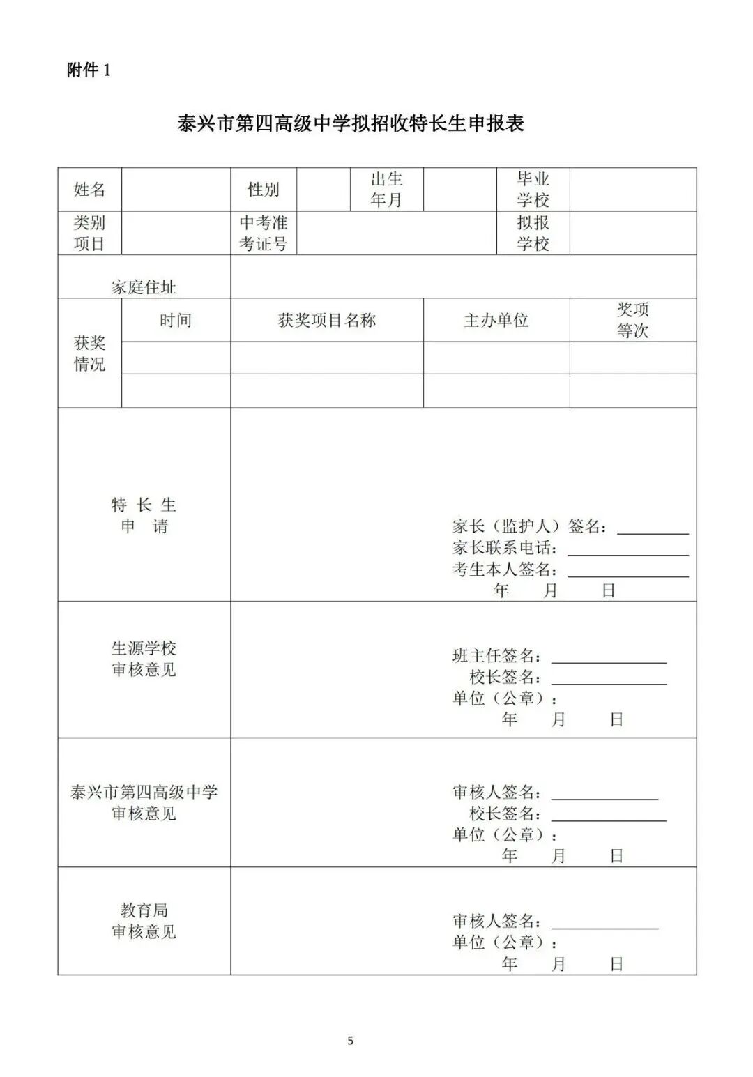 4.4月24日-30日在政府门户网站、泰兴教育网站、泰兴市第四高级中学网站和学生所在学校门户网站、校内校务公开栏及所在班级同时公示符合各招生学校特长生报名条件的学生名单。
