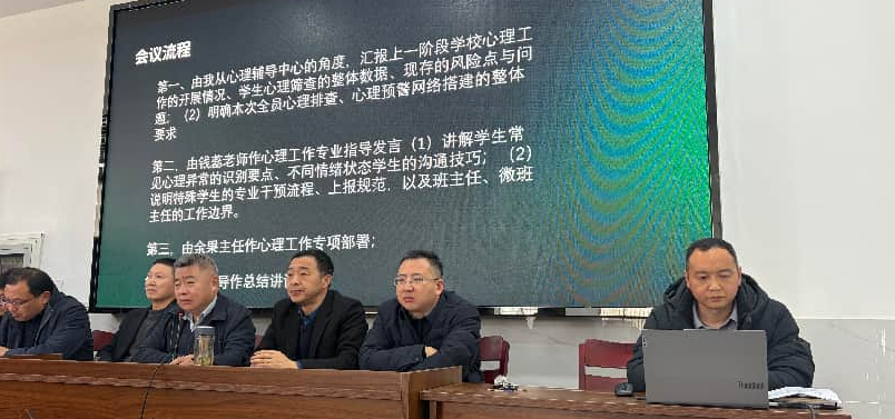 会议伊始,校团委项银圣书记总结2025年学校心理健康教育工作情况,明确全员心理排查、心理预警网络搭建的整体要求。2025年,学校以“守护学生心理健康,促进学生全面发展”为核心,扎实推进心理健康教育各项工作:完善心理辅导室硬件设施与师资配备,为学生提供个体咨询、团体辅导服务;通过主题班会、讲座、心理情景剧等多样活动,普及心理知识,提升学生心理调适能力;建立初步心理排查机制,及时跟踪干预学生心理异常情况;加强心理教师队伍培训,切实提升专业干预素养。